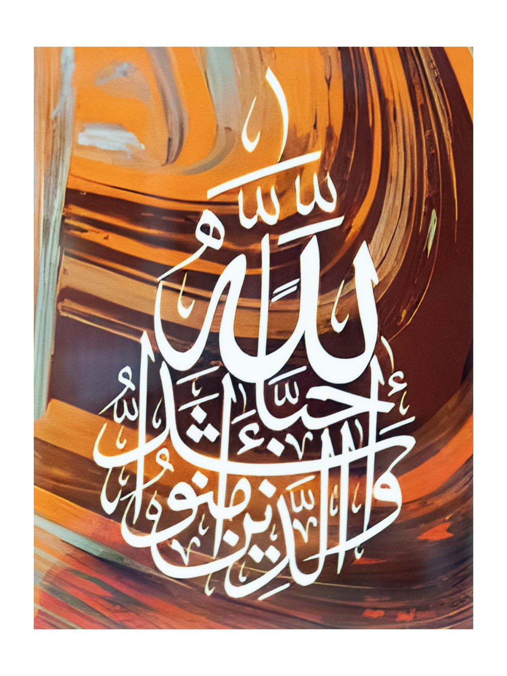 Enhance your home with this exquisite Surah Al-Baqarah Frame, featuring Verse 165 (2:165) in stunning Arabic calligraphy. The design showcases a vibrant red, orange, brown, and green background, beautifully contrasted by white Arabic text, all encased within a sleek black frame border for a modern and elegant finish.