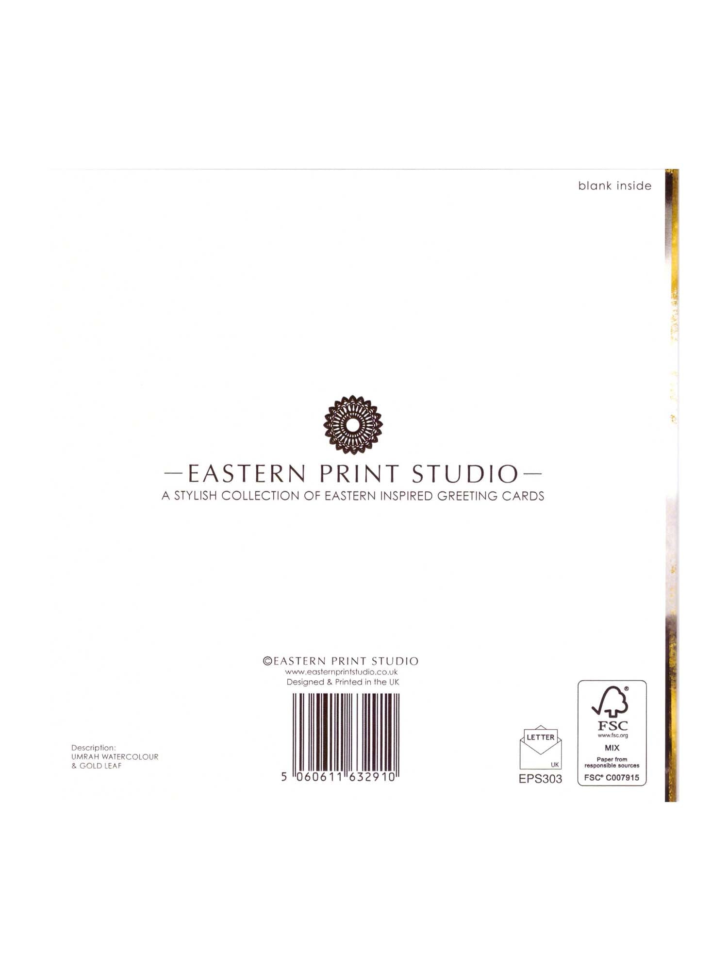 Mark the Umrah milestone in style by sending your loved ones this beautiful design to celebrate a truly amazing journey. Watercolour wash with printed gold leaf details.
