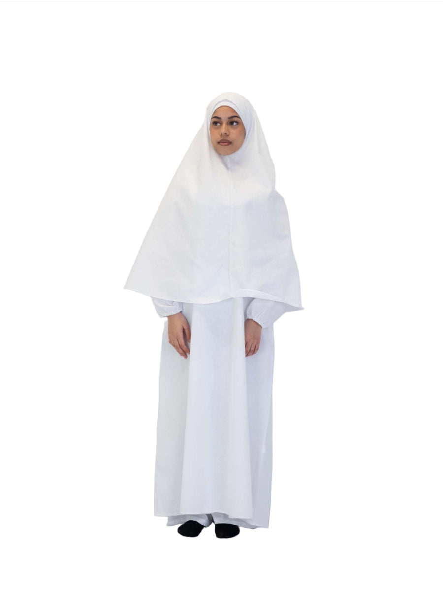 Our premium textured plain white abaya is made from raw cotton⋅ Extreme care is taken during the manufacturing process to ensure the fit and the stitching quality is at the optimum standard giving you the premium feel where compromise is not an option⋅ The Abaya features pockets in the seam of the abayas which remains hidden and is perfect for daily and casual wear⋅ Burkah and headband also included and to top it off we have also included a matching elasticated waist trouser⋅ This set Ideal for Hajj and Umrah and the cotton fabric is perfect to beat the hot climate.