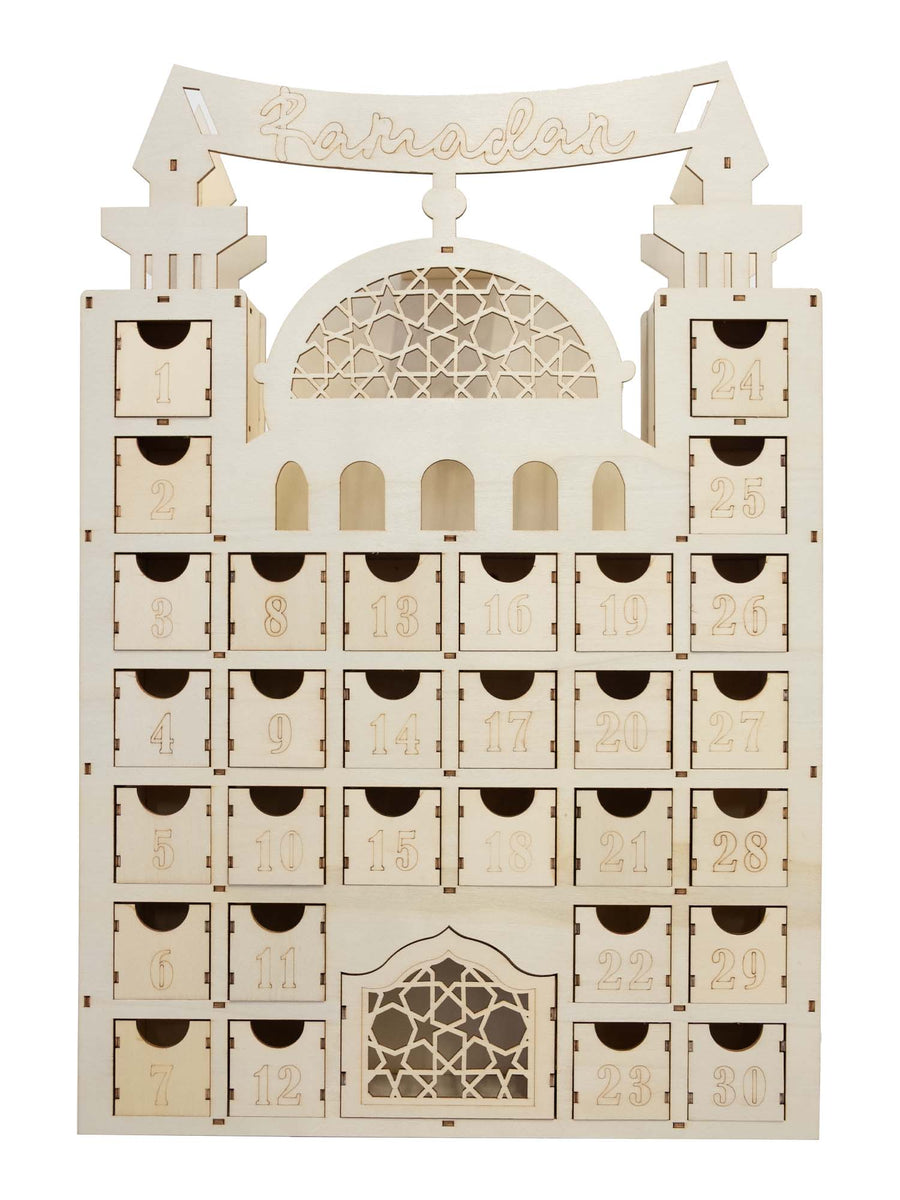 Wooden Ramadan Advent Calendar – Mosque Design with 30 Compartments & LED Light
