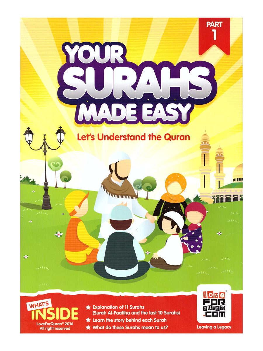 This book looks at 11 Surahs of the Quran, Surah Al Faatiha and the last 10 Surahs. This book is aimed at 9 year olds to adults. Each surah has at three pages dedicated to it.